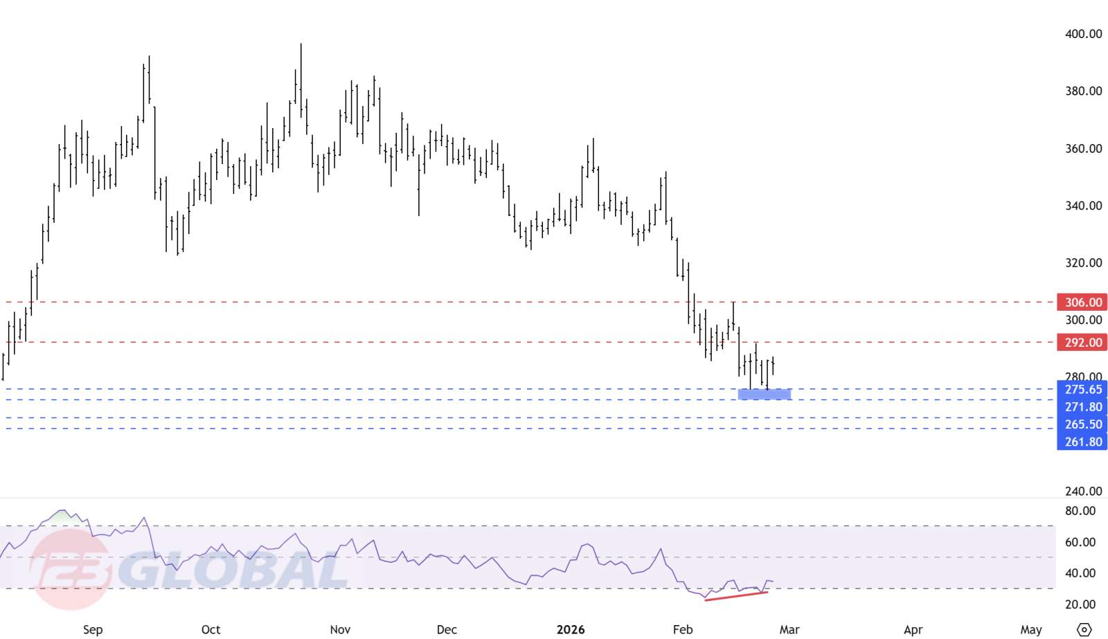 •        Hỗ trợ: 271.80 – 275.65. Nếu phá vỡ, giá có thể mở rộng đà giảm về vùng 261.80 – 265.50.