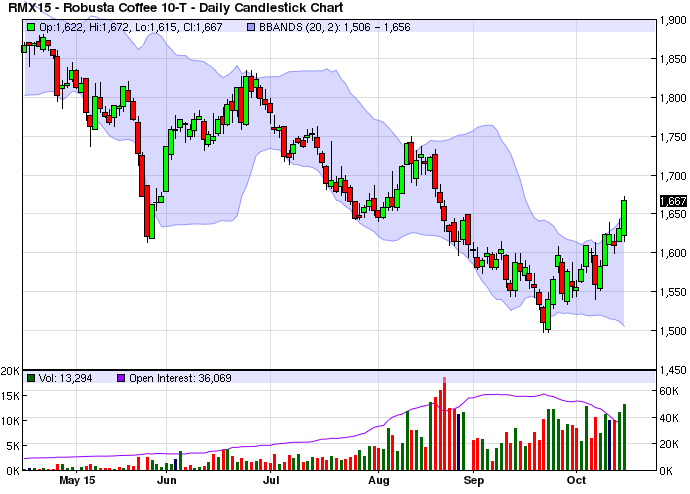 Tuy nhiên, đà giảm giá cà phê arabica tương lai có phần hạn chế do đồng real tăng giá so với đồng USD. Trái ngược với thị trường cà phê arabica tương, thị trường cà phê robusta tương lai tăng giá khá mạnh và xảy ra hiện tượng vắt giá khi giá hợp đồng giao gần cao hơn giá hợp đồng giao xa (nghịch giá).